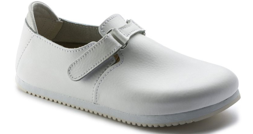 La clásica plantilla de corcho contorneada de Birkenstock ofrece comodidad y soporte para turnos largos de pie. La parte superior es de cuero recubierto de poliéster que resistirá las manchas y la suciedad.